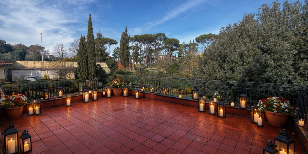 Gli spazi esterni sono uno dei punti di forza della location. Le terrazze panoramiche e il giardino ampio e curato permettono di organizzare aperitivi all’aperto, corner fotografici e zone relax.