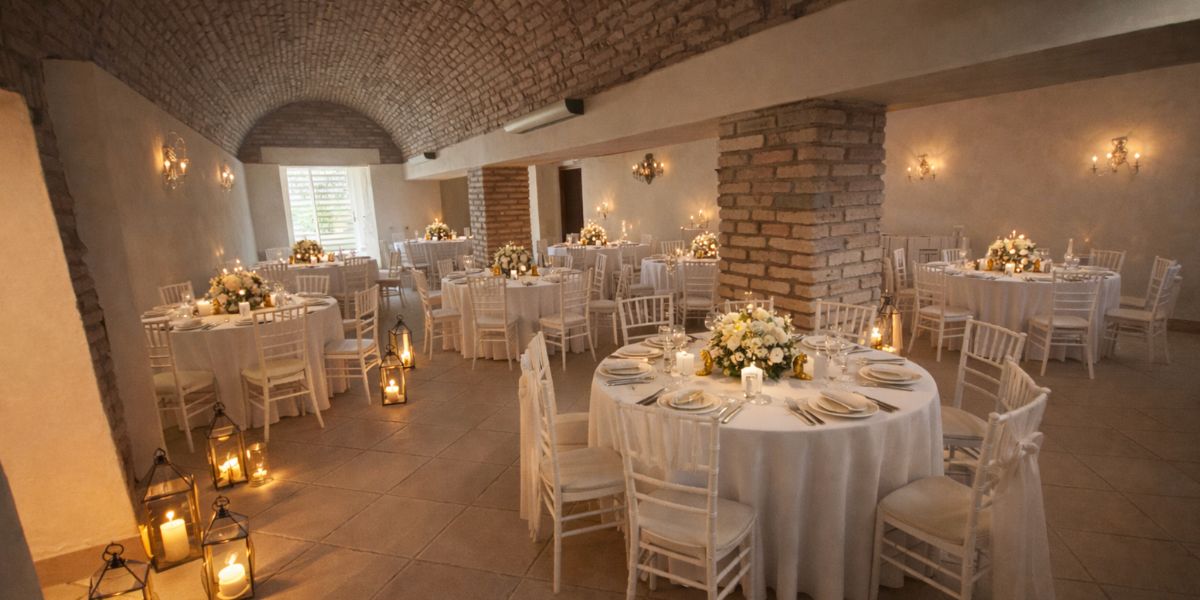 Il salone principale con travi in legno a vista e camino offre un ambiente elegante e accogliente, perfetto per l’accoglienza degli ospiti. Al piano inferiore, la suggestiva Sala Grotta con soffitti a volta e mattoncini a vista si trasforma facilmente in pista da ballo, creando l’atmosfera ideale per musica, dj set e intrattenimento.